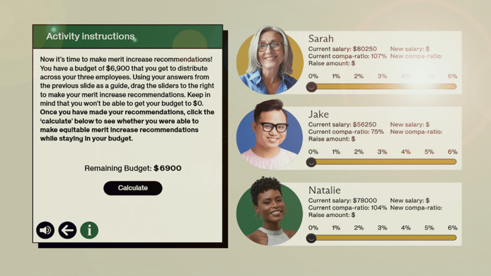 From 2023 – 2024 I led my team in developing the training materials for Guild’s updated pay and performance framework. The below training is one of the eLearnings I developed to prepare managers for making merit increase recommendations.